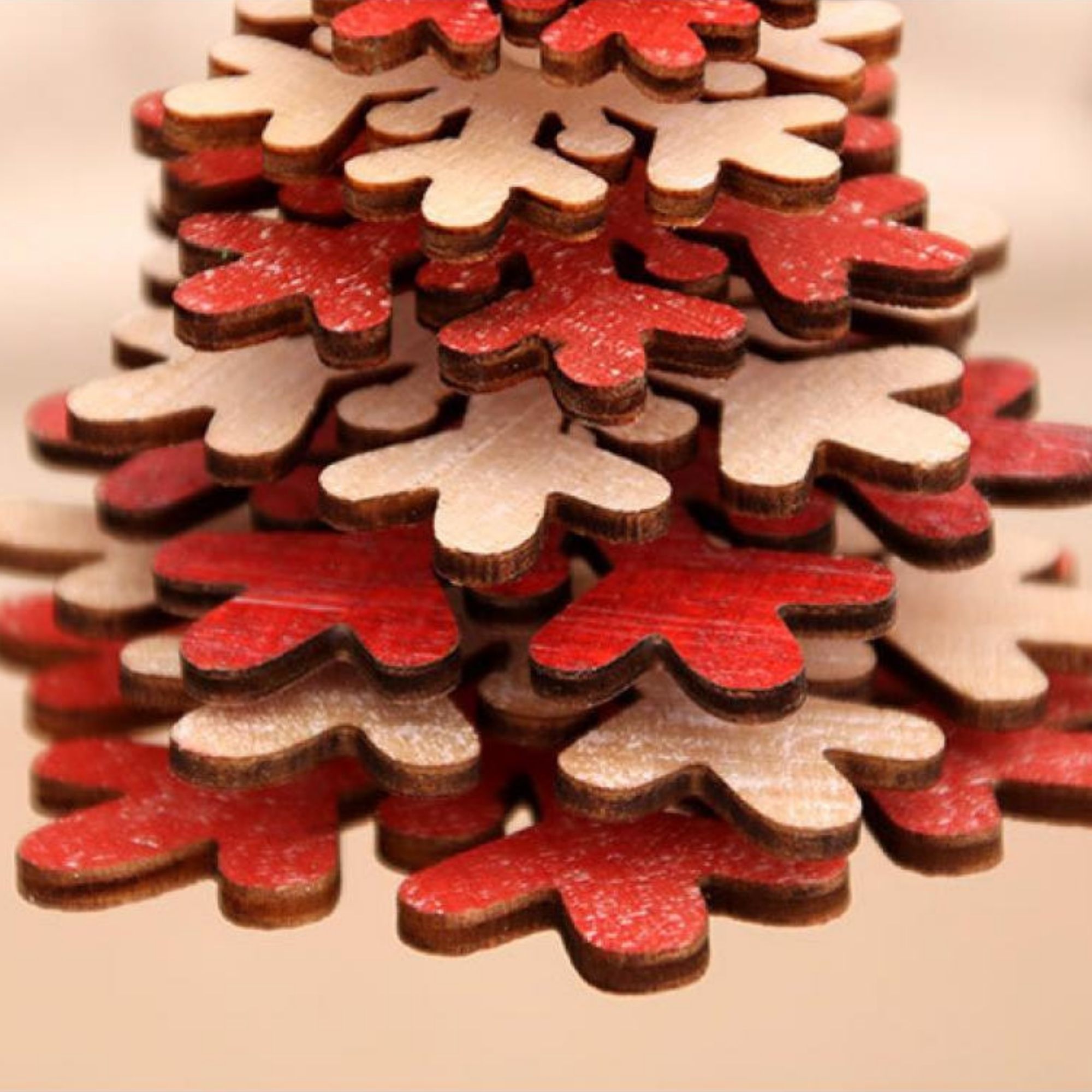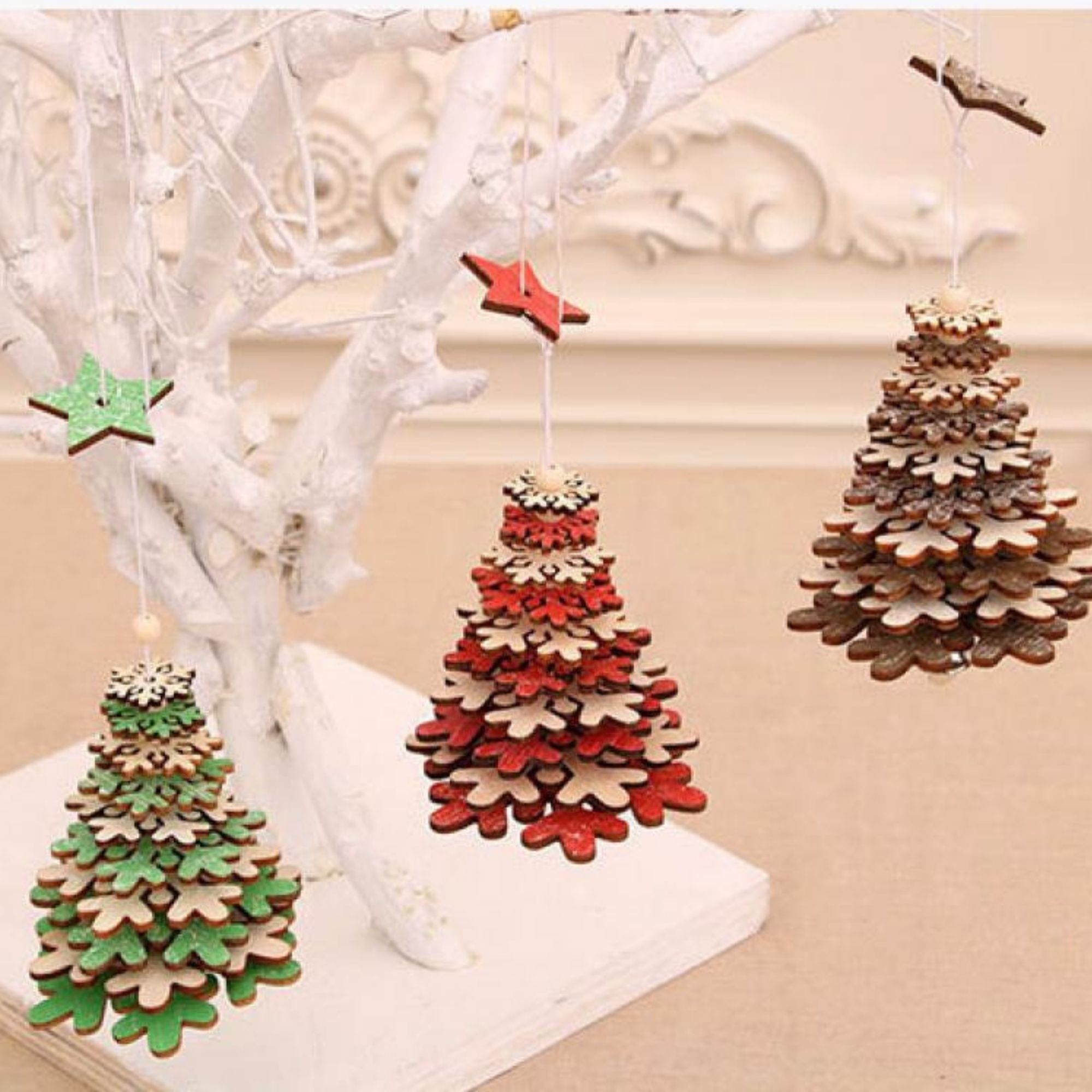 Wooden tree ornaments. With puzzle shaped snowflake leaves.